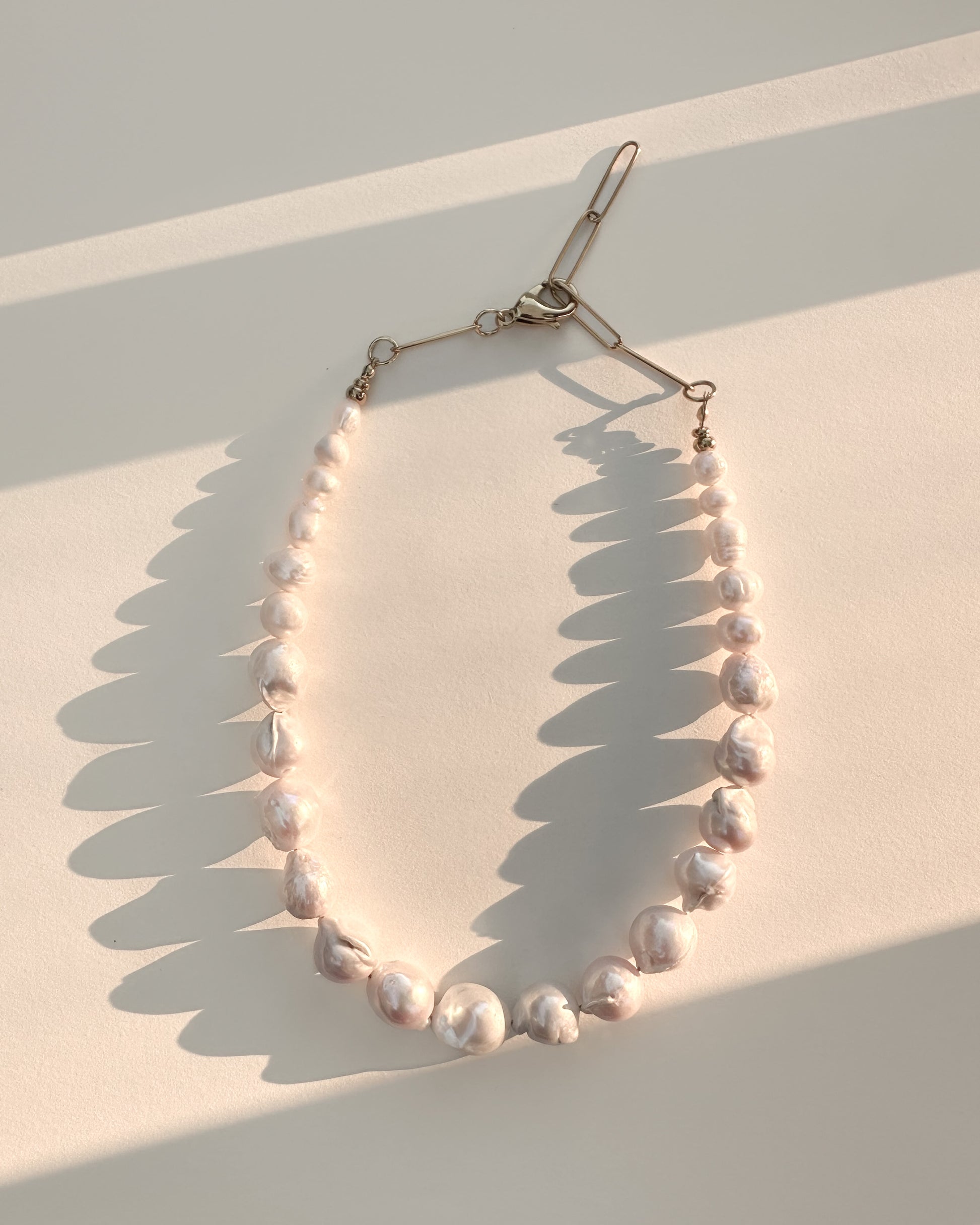 Striking yet effortlessly wearable, this necklace features lustrous baroque fresh water pearls — each one unique in shape and sheen. Finished with a bold gold-plated stainless steel chain and clasp, it brings a modern twist to a timeless classic.