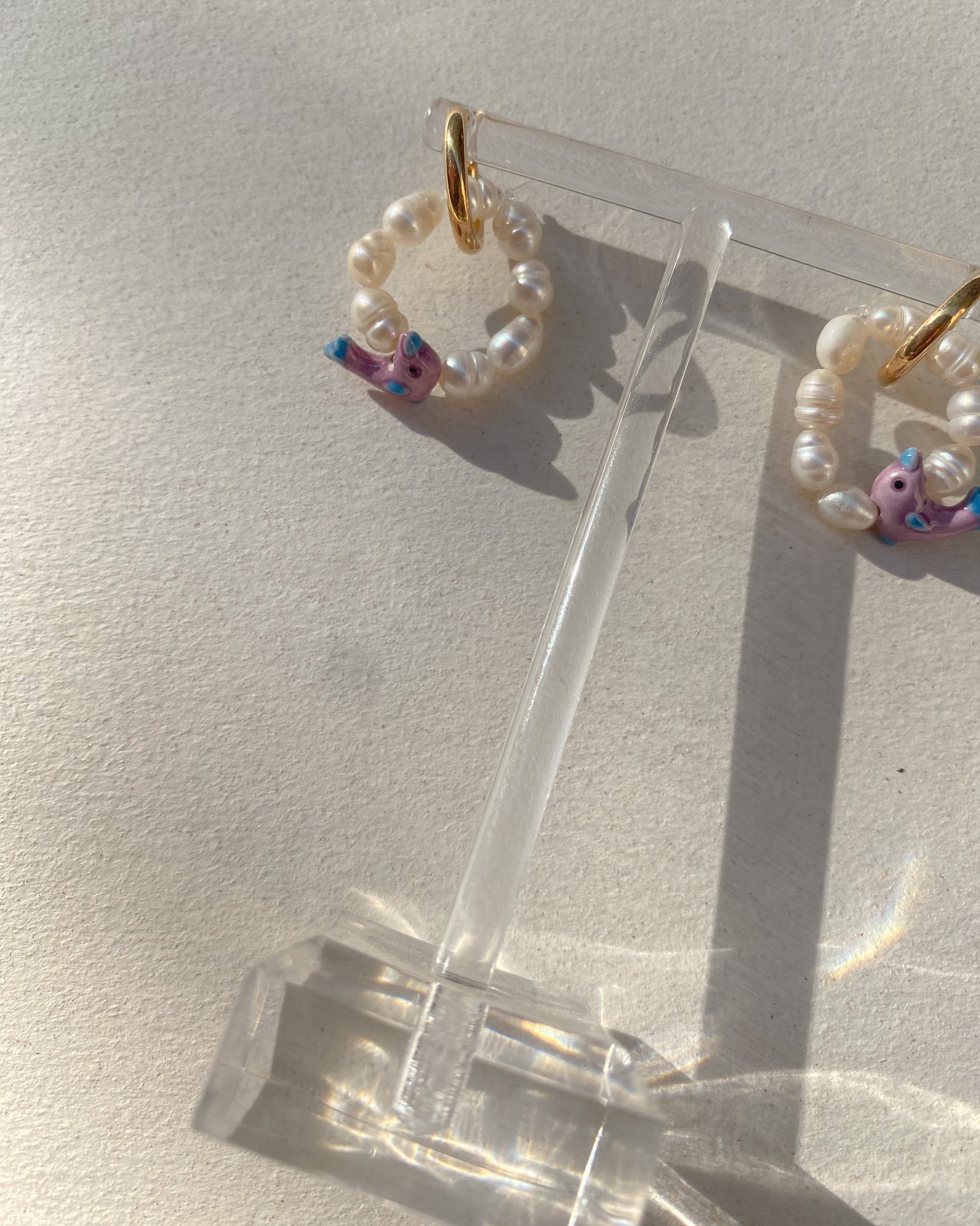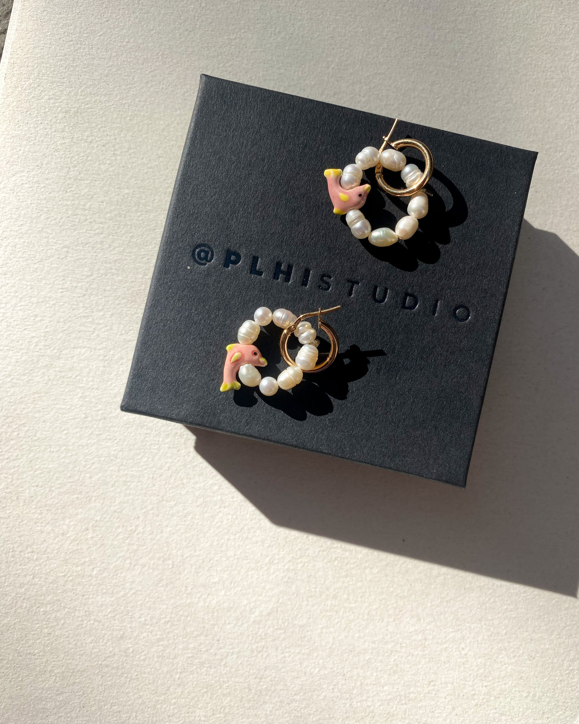 The dolphin hoops are made by us at the Barcelona studio from freshwater pearls and a clay dolphin, we use a 925 silver hoop (gold plated or not)