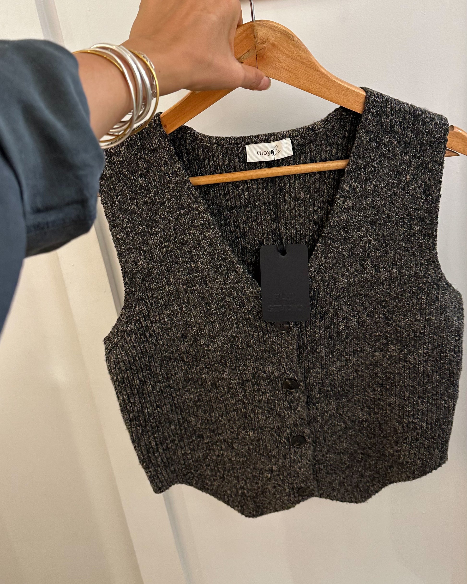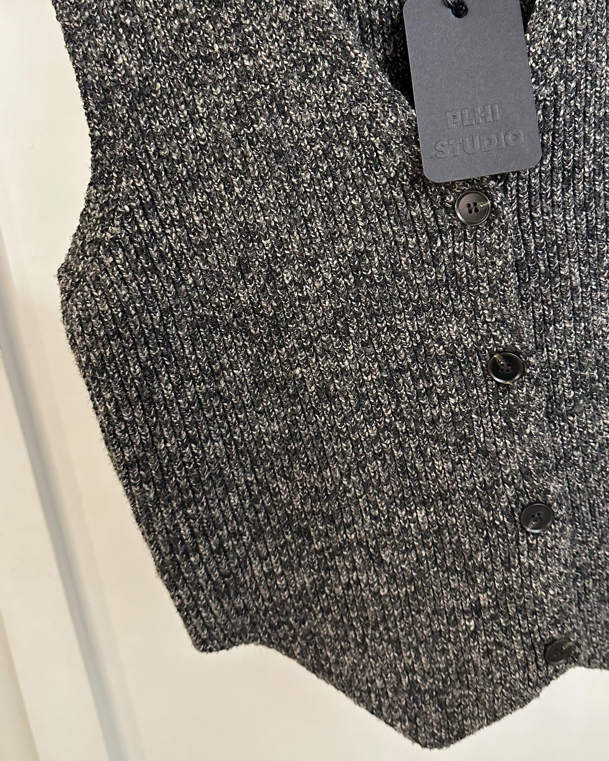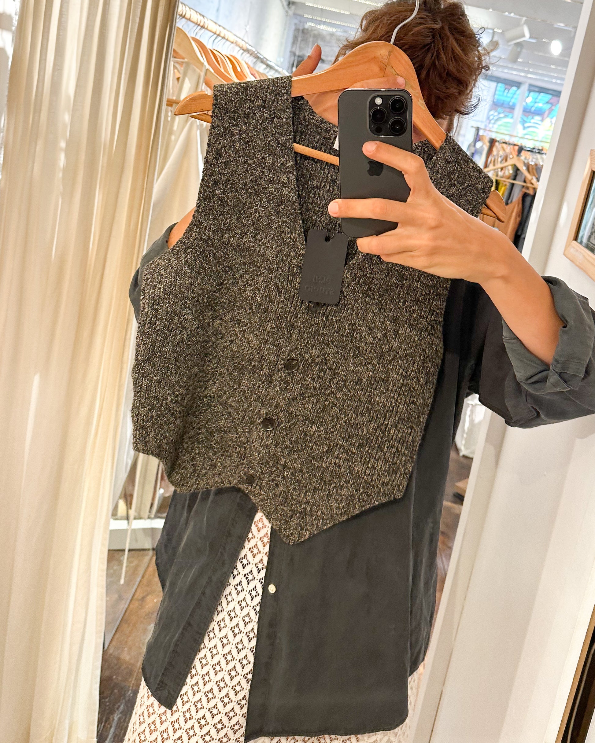 This knit vest combines the structure of a classic formal vest with the comfort of a cozy knit. Crafted in a jaspé blend of brown and black, it’s the perfect modern piece for your wardrobe, offering versatility year-round.