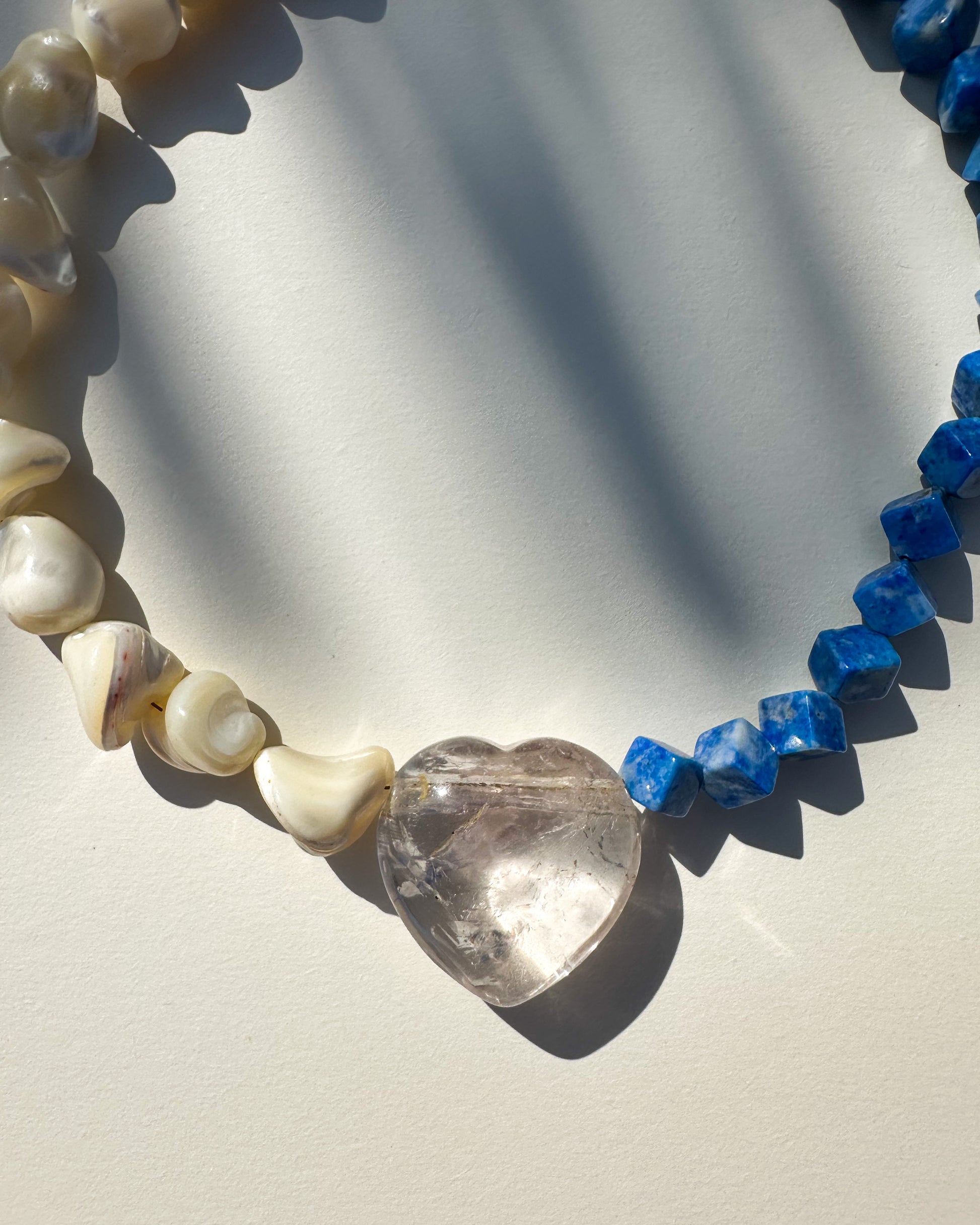 A balanced contrast of color and texture, this necklace features cube-cut lapis lazuli on one side and organically shaped nacre beads on the other. At the center, a translucent quartz heart adds softness and light.