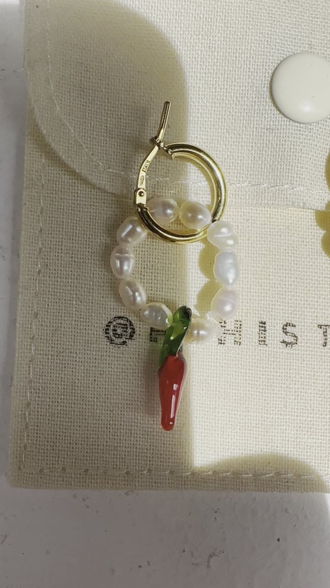 The pearls and chili hoops are beaded by us at the Barcelona studio from freshwater pearls and a glass cherries, we use a 925 silver hoop (gold plated or not)