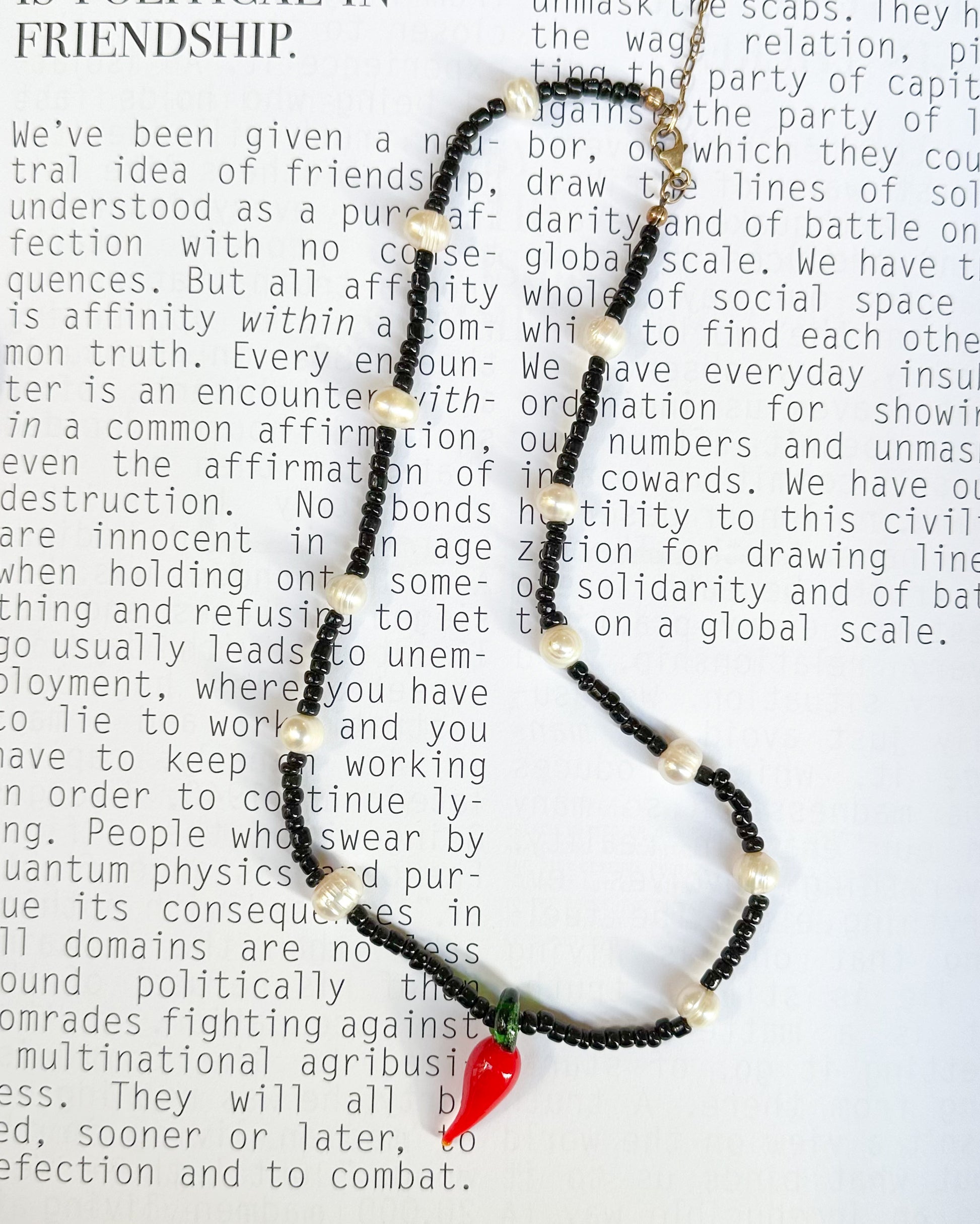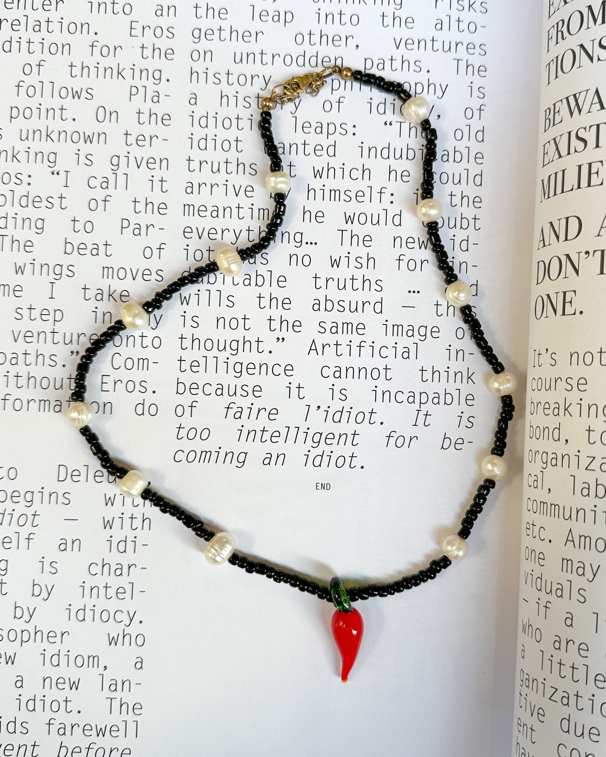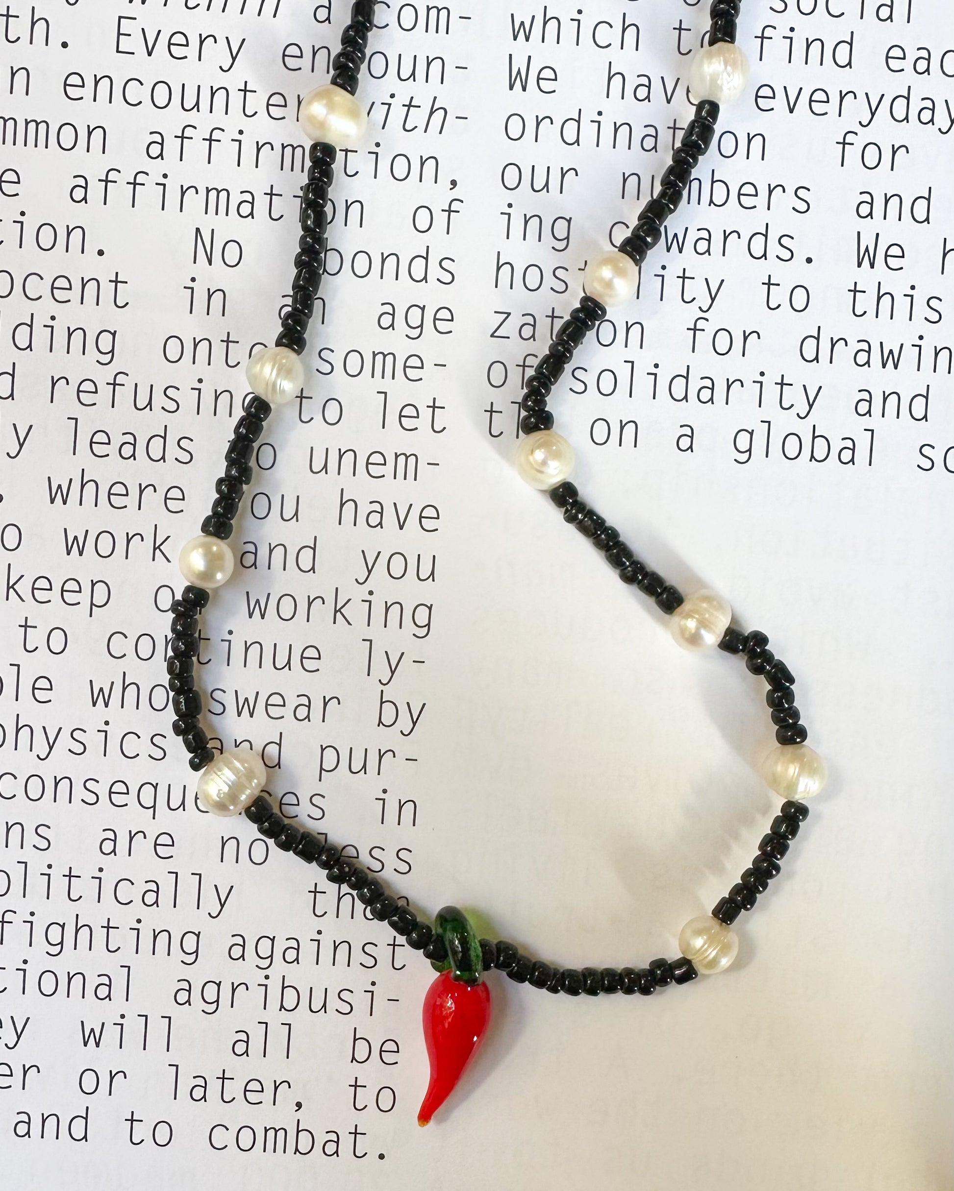 Beaded by us at the studio the pearls, chilies and beads necklace is part of the new summer jewelry collection.