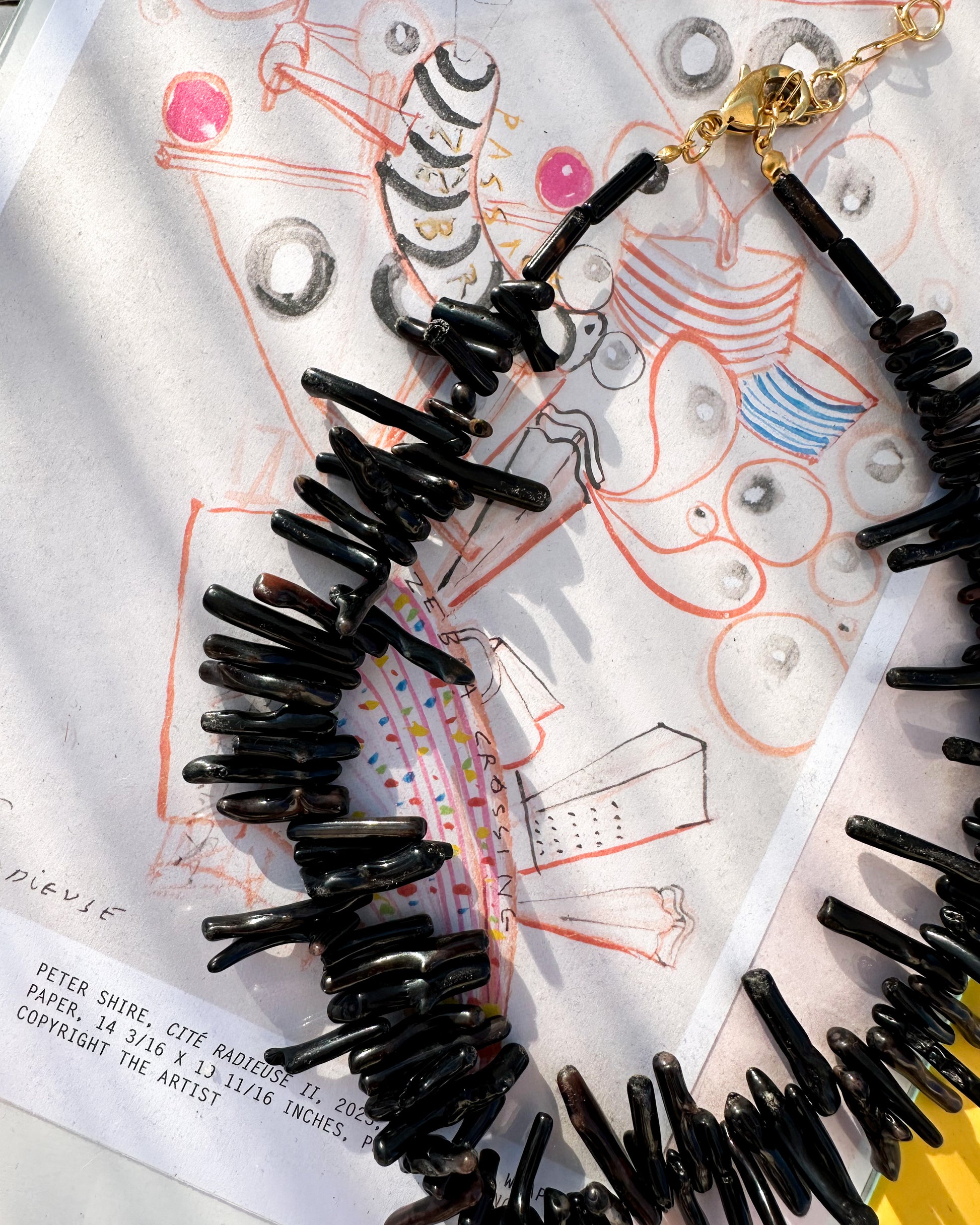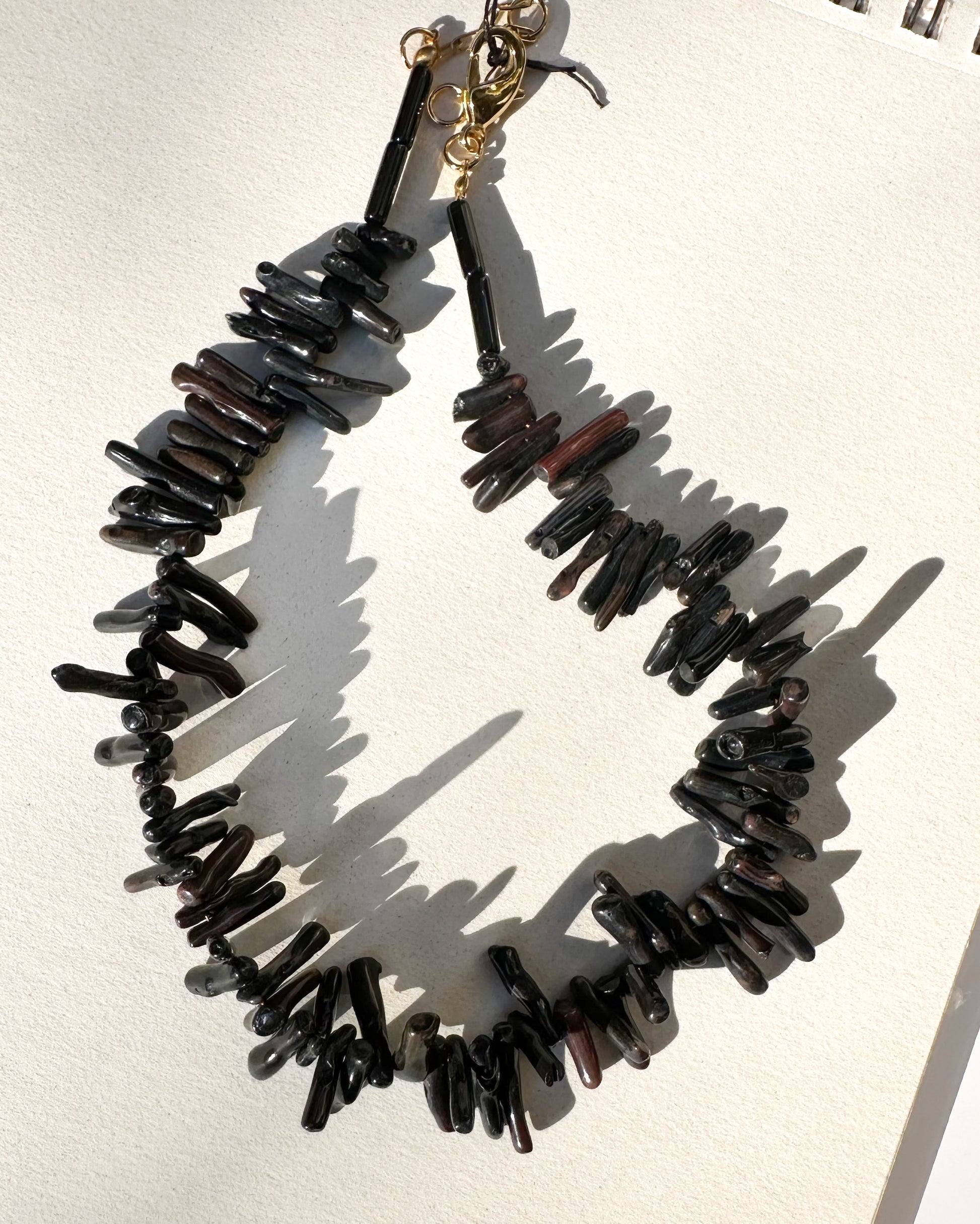 A bold and moody statement. This necklace is hand-strung with irregular black howlite spikes and cylindrical accents that create a striking silhouette full of texture and rhythm. Its deep tones shift subtly between black, dark brown, and wine red depending on the light.