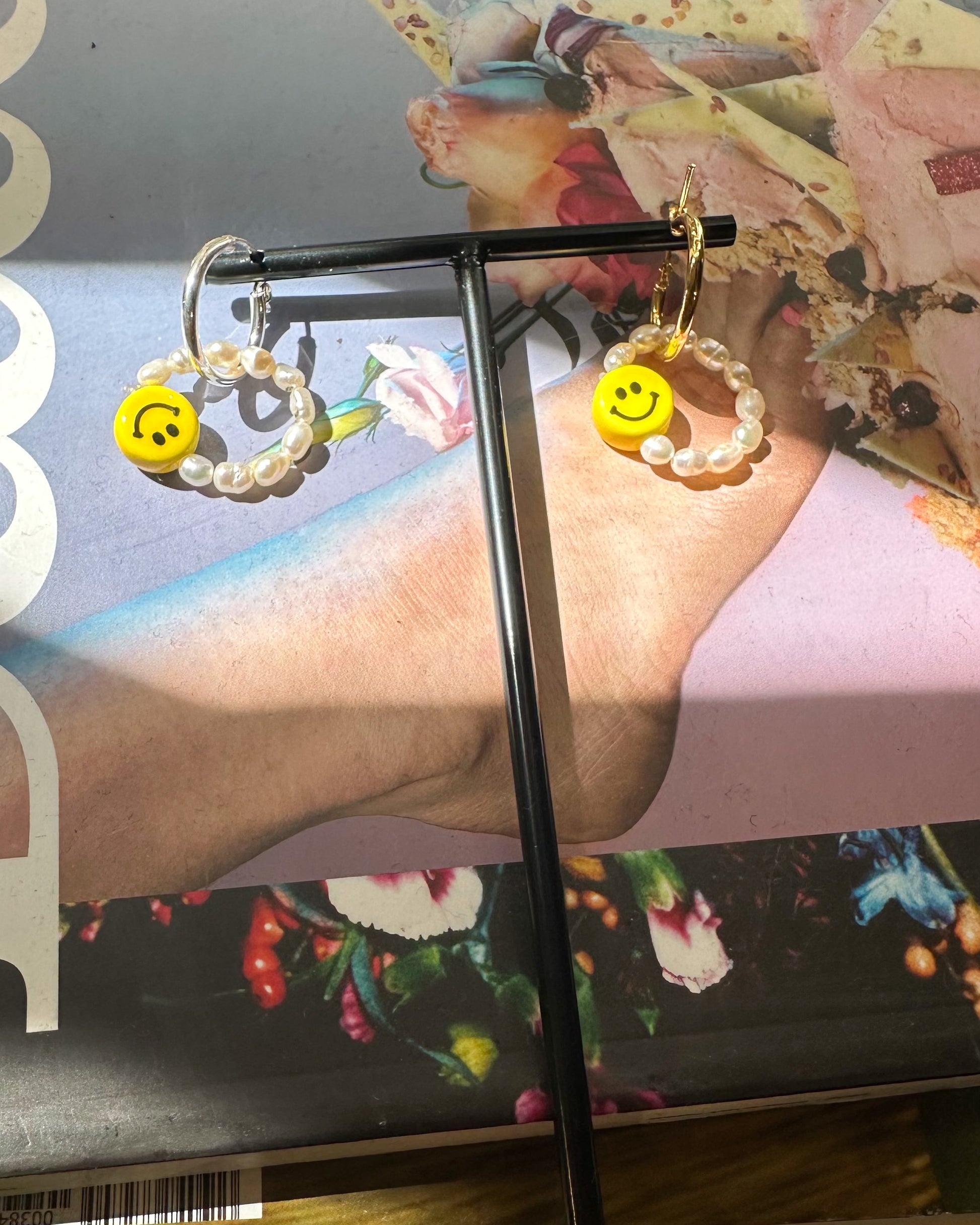 The smile & pearls hoops are beaded by us at the Barcelona studio from freshwater pearls and a clay smile, we use a 925 silver hoop (gold plated or not)