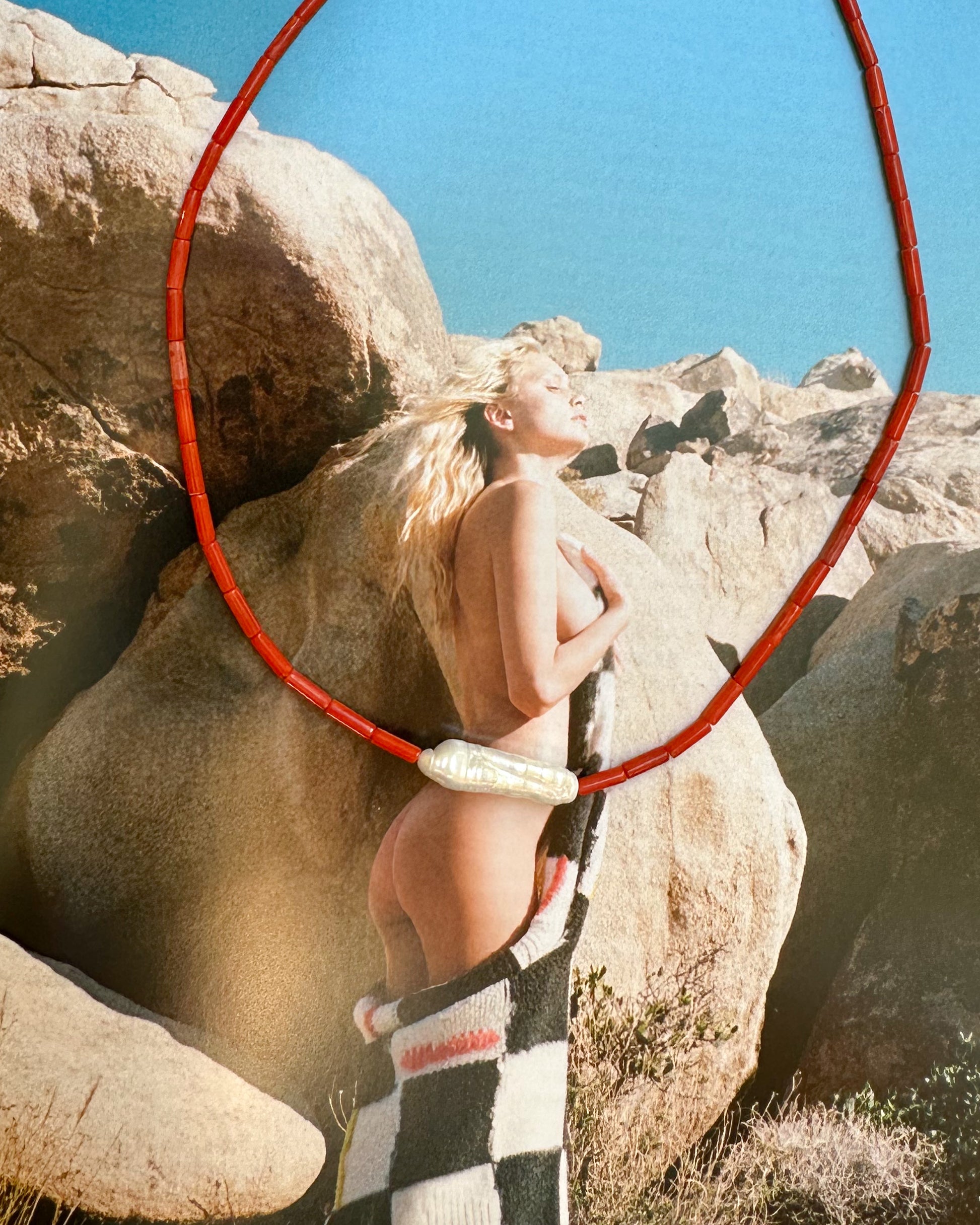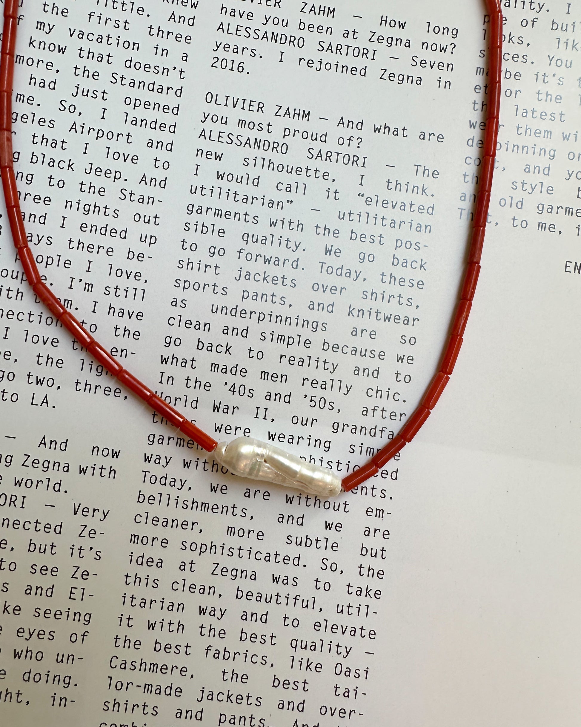 Something red necklace, stone and pearls.