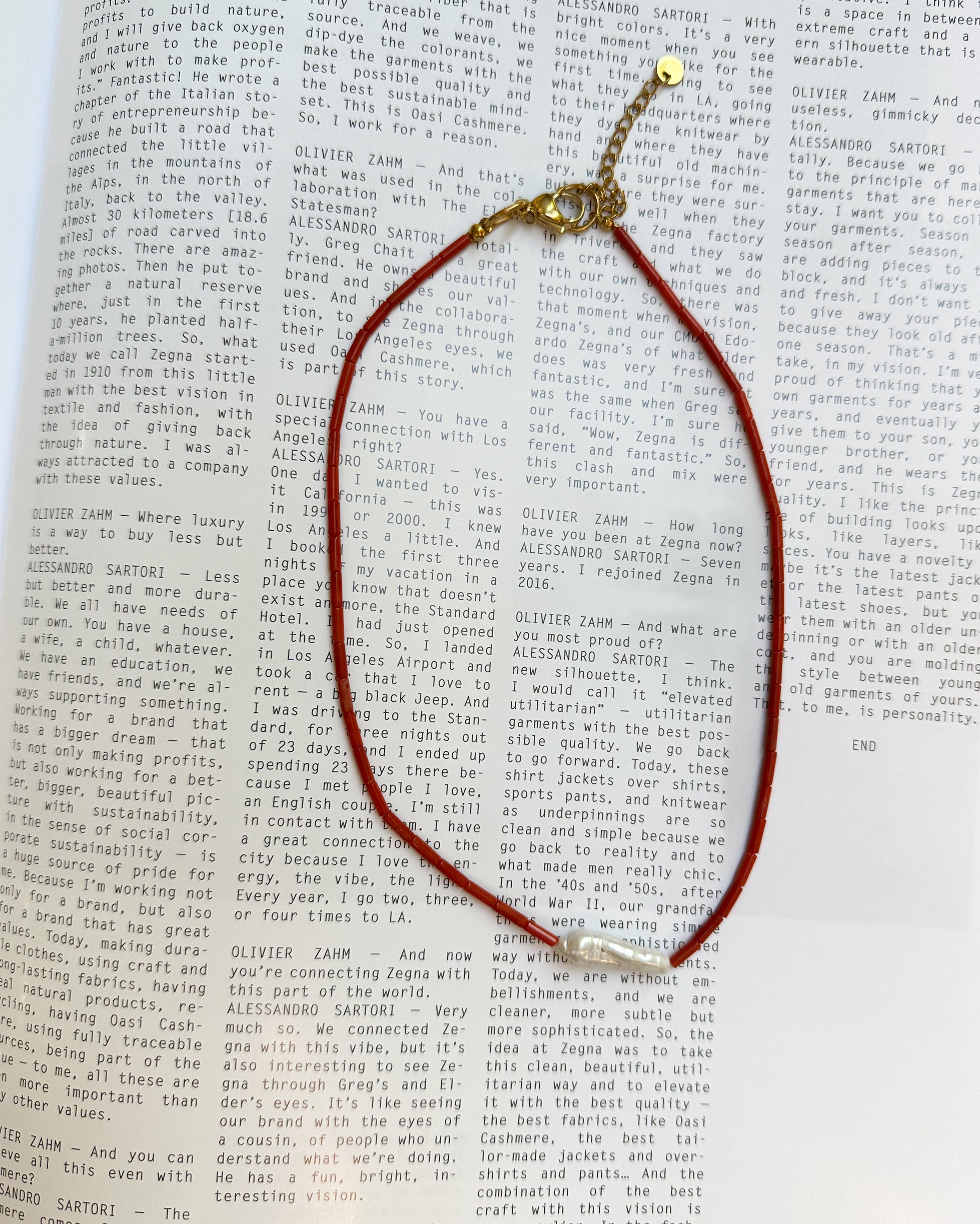 It is made with glass cylinders and freshwater natural pearl. Check out the other pearl + red necklace options, there are many!