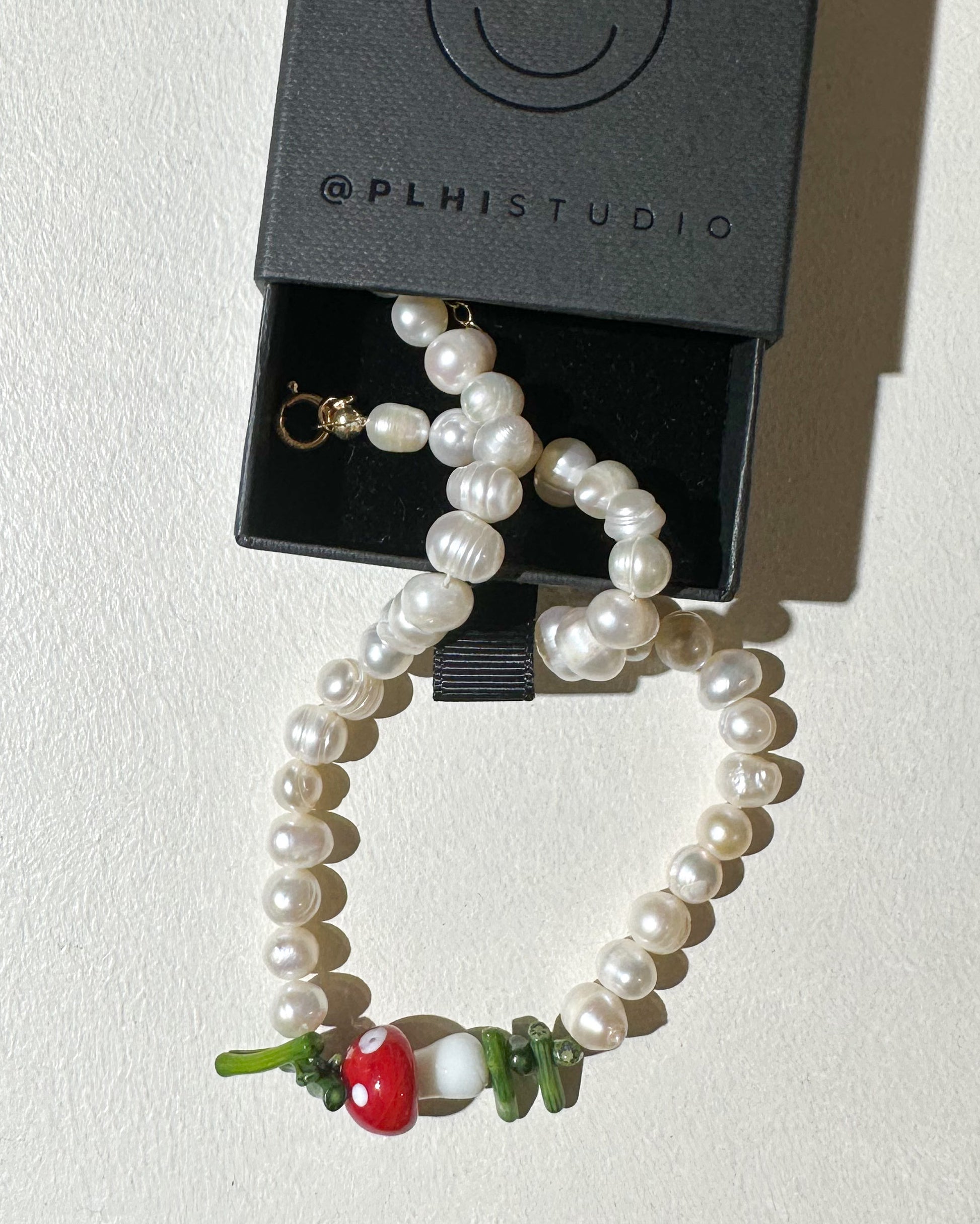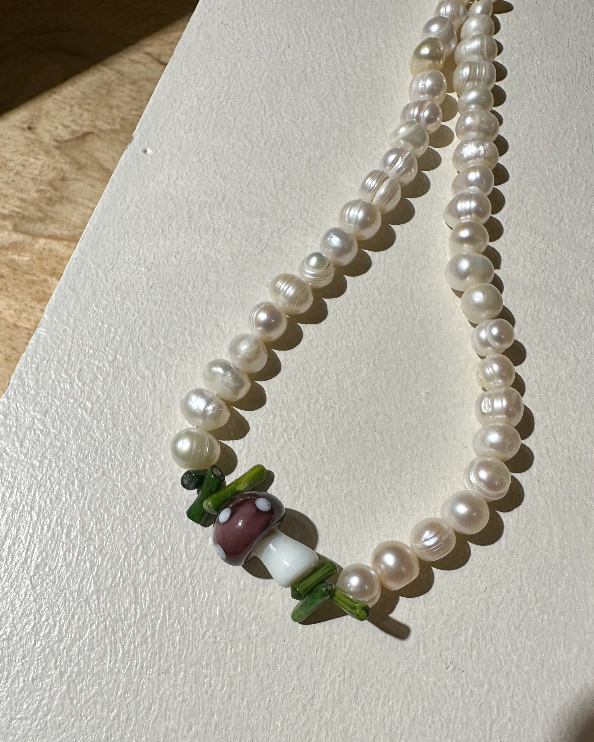 The lost mushroom necklace is beaded by us at the studio using fresh water pearls, stones and a glass mushroom piece.