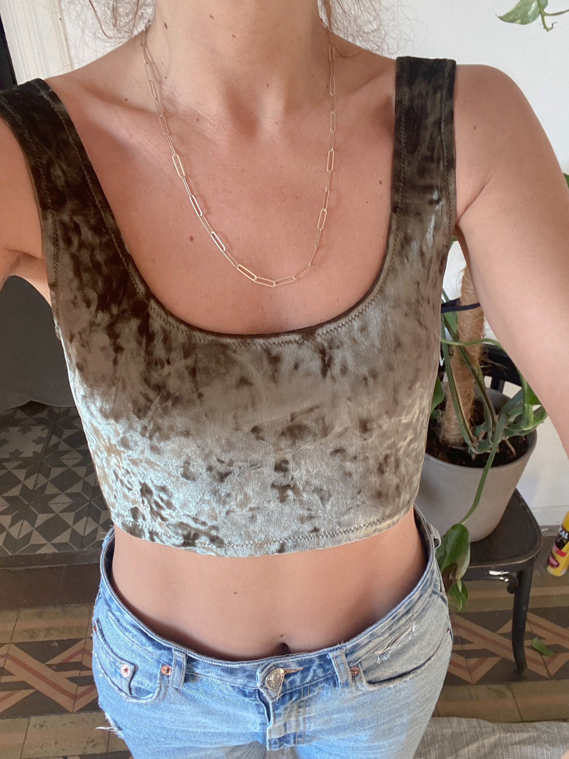 Our sport-inspired crop top, now in velvet, is designed to keep you comfortable while adding a touch of elegance, it’s perfect for anything from a day at the beach to a casual night out with your favorite jeans.